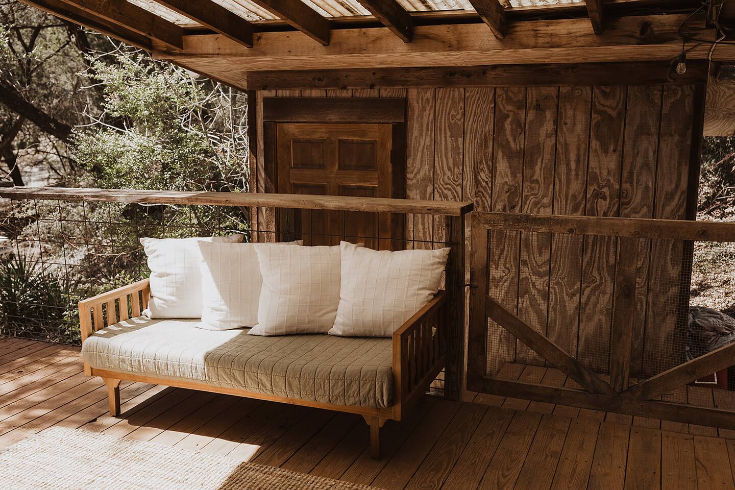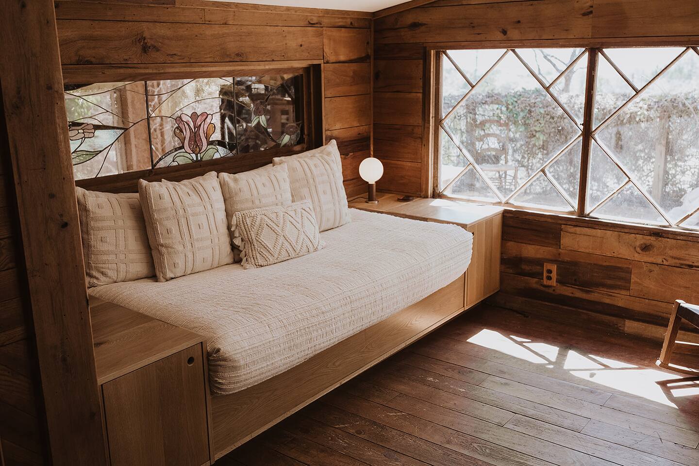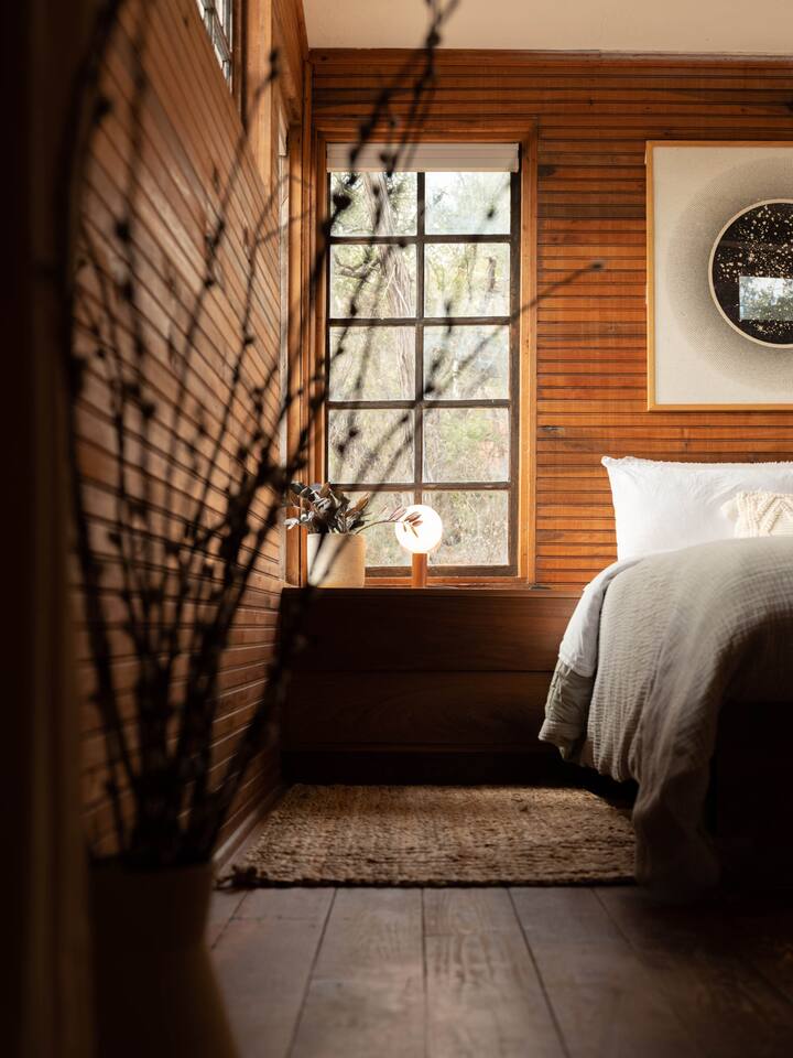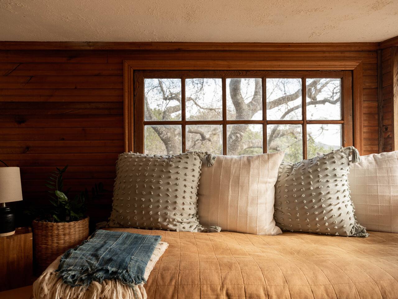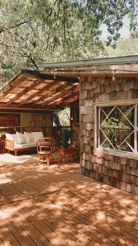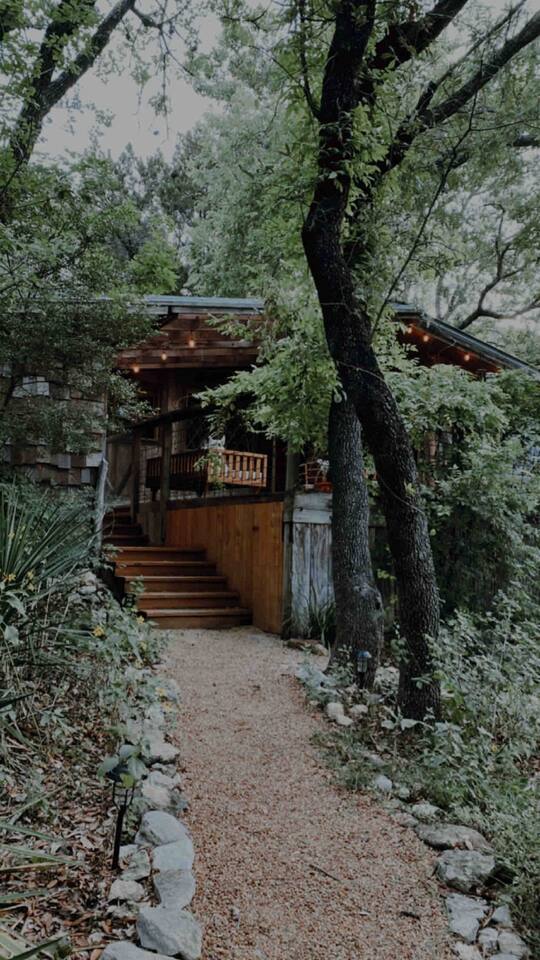 Built in 1975, this handmade cabin is a true Austin original. High on charm and replete with all the modern comforts you'd expect, recent updates include custom kitchen and gorgeous built-in woodwork throughout. Although the space is located just thirty minutes from downtown Austin, you'll be utterly transported by the wooded setting and shimmering lake views. The cabin is adorned with vintage textiles from around the world, handmade piece from makers near and far, and natural elements that highlight the rustic beauty of the space. The large covered patio is the perfect place to start the morning with a cup of coffee and unwind at the end of the day as you watch the hill country sunset. The house features a light-filled master bedroom and reading loft, antique clawfoot bathtub, custom-built kitchen, dining area that seats four, as well as a living room and spacious covered patio. The second bedroom stands apart from the main house, and offers ample privacy. The kitchen is fully stocked with Canyon coffee, organic herbal tea, and everything you'll need to cook a gourmet meal. During your stay you'll have full use of the four burner electric stove, convection oven, mini fridge, outdoor chest freezer, stainless steel pots and pans, high quality chef's knives, stoneware, wine glasses, french press and pour-over. This cabin truly is the perfect place to get away for an evening, weekend, or more. Please feel free to reach out with any questions or concerns. We look forward to hosting you!
